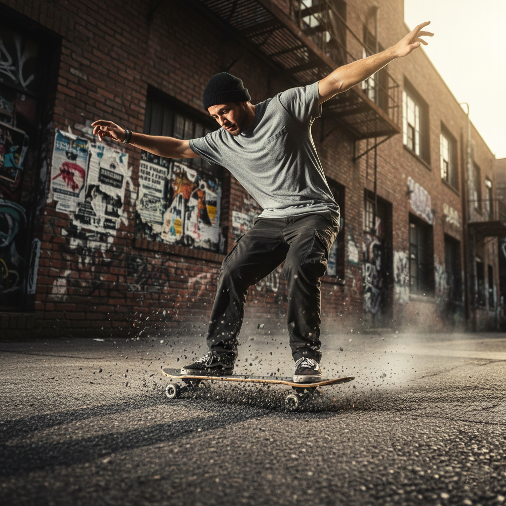 La clave para construir esta fotografía está en elegir un ángulo que enfatice la fricción entre las ruedas y el pavimento. Un encuadre más bajo, cercano al suelo, permite que el polvo o las pequeñas partículas levantadas por la derrapada se conviertan en protagonistas visuales. Además, este ángulo ayuda a estilizar las líneas del cuerpo del skater, haciendo que la postura se vea más marcada y fluida. La ropa holgada, los colores contrastantes y un fondo urbano —como muros con textura, grafitis o un callejón iluminado por luz natural— ayudan a reforzar esta estética callejera tan propia de la cultura skate.