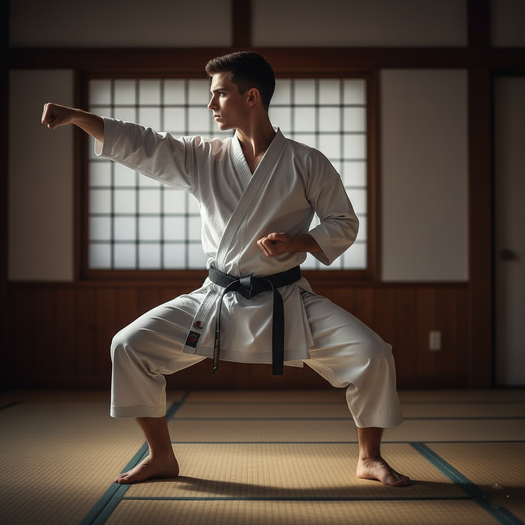 This pose is perfect for action portraits and for showcasing the discipline, control, and aesthetics of karate, conveying a message of strength and concentration combined with elegance.