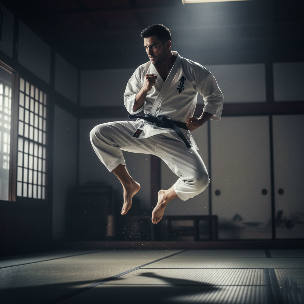 Lighting and framing are essential. Side or overhead lighting can highlight the folds of the kimono and the musculature, creating depth and drama. The background should be clean or minimalist, such as a dojo or an open space, so that all the attention is focused on the pose and gesture. The composition can capture the full body or a medium shot that emphasizes the arm and leg technique.