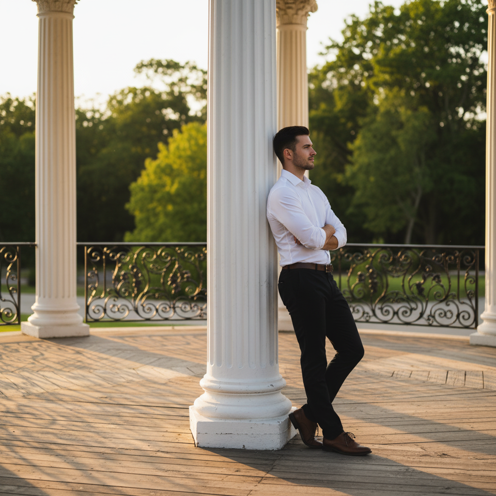 The pose of leaning against a column is one of the most versatile and expressive within the setting of a kiosk. It conveys serenity, confidence, and a natural connection with the space. It’s ideal for individual or couple portraits, as it balances the strength of the architectural environment with the subtlety of the human gesture. This pose works very well in both vertical and horizontal compositions, depending on the desired focus.