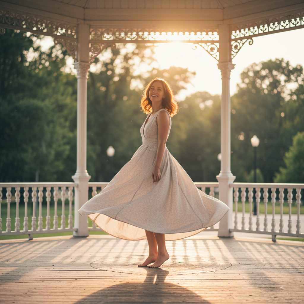 The key is to capture the precise moment of the turn or step. The body should remain relaxed, with a slight tilt to one side and arms free to accompany the movement. If wearing a flowing garment—such as a dress or skirt—the turn will highlight the dynamism of the scene. The steps don’t need to be large; simply move slowly while glancing behind you or offering a gentle smile to the camera. This blend of naturalness and elegance creates a sense of visual freedom.