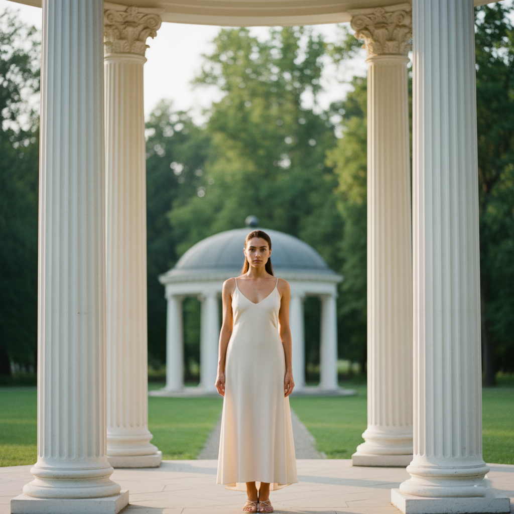 The background plays an essential role. By focusing on the structure of the kiosk, the lines of the columns and the roof will naturally guide the viewer’s attention to the subject. Therefore, it is important to maintain a balance between light and shadow. Soft light—like morning or dusk—is best suited for this pose, as it allows you to highlight contours without creating excessive contrast.