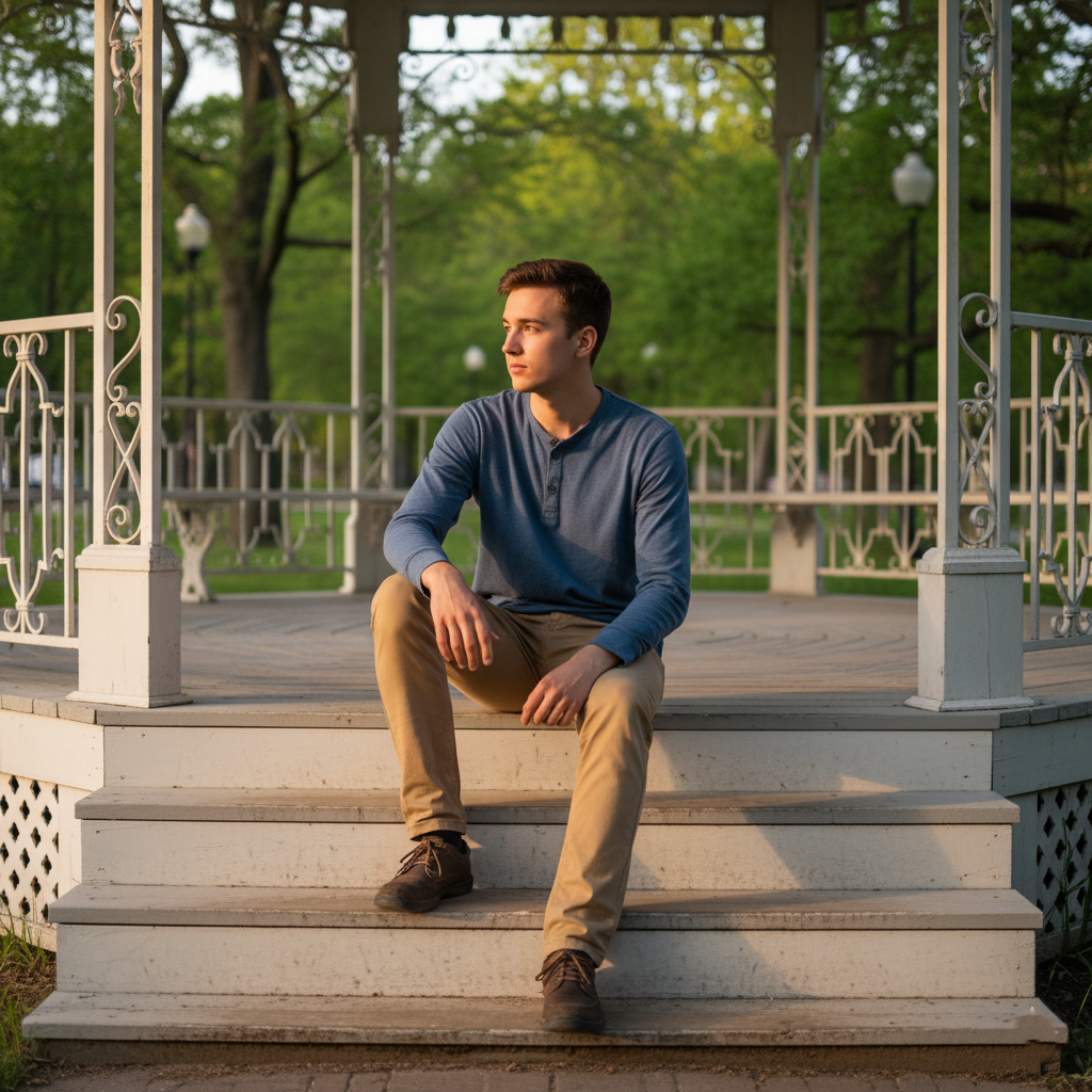 The kiosk offers an ideal visual context for this pose. The columns provide vertical lines that frame the figure, while the open setting of the park or plaza adds a green or urban backdrop that complements the composition. If the photograph is taken at sunset, the side lighting casts soft shadows on the face and body, creating a warm, cinematic effect.
