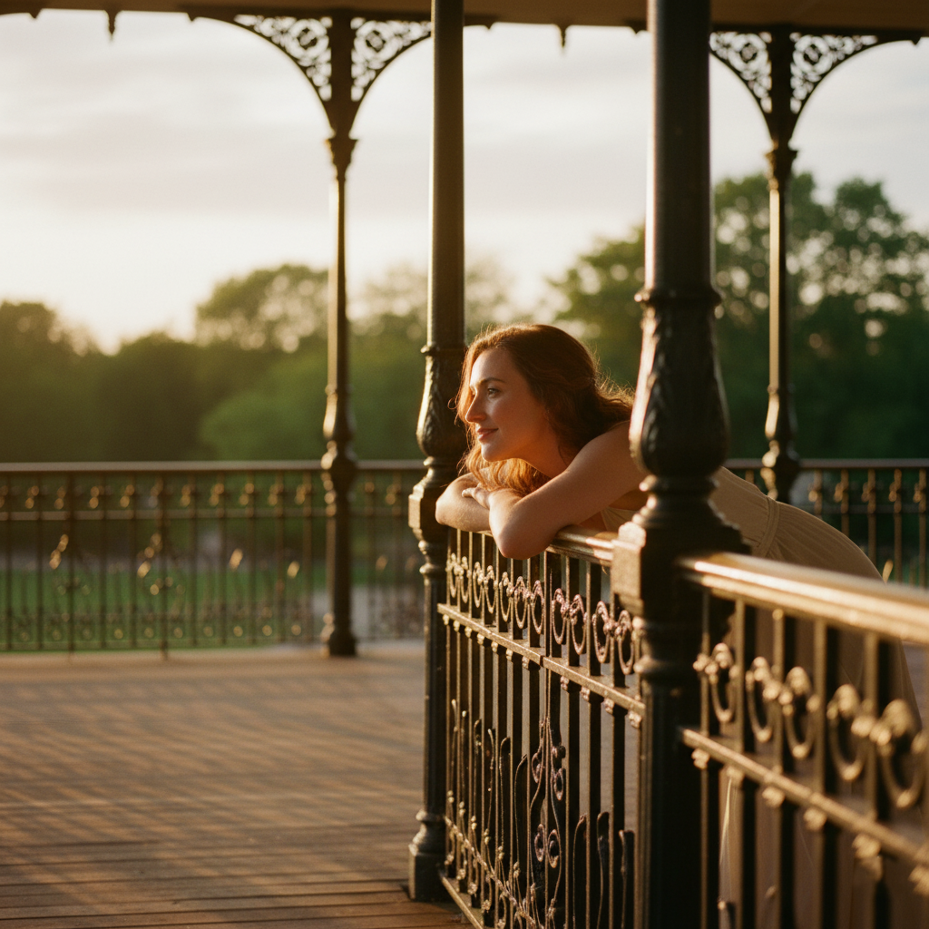 This pose also allows the clothing to stand out. Light garments, flowing dresses, or classic outfits contrast beautifully with the sturdy structure of the kiosk. Thus, the image achieves a balance of elegance and simplicity, becoming a harmonious and timeless portrait.