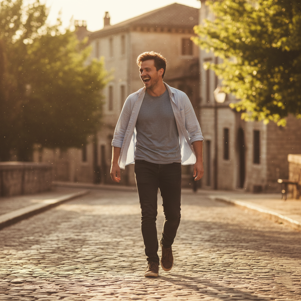 Walking while laughing is one of the most natural and cinematic poses there is. This idea combines movement and emotion, creating an image full of dynamism and authenticity. The key is not to look directly at the camera, but to let your body flow with the stride, as if the laughter arose during a conversation or a joyful thought. It’s an ideal pose for outdoors, especially in streets, parks, or open paths, where the surroundings provide context and depth to the photograph.