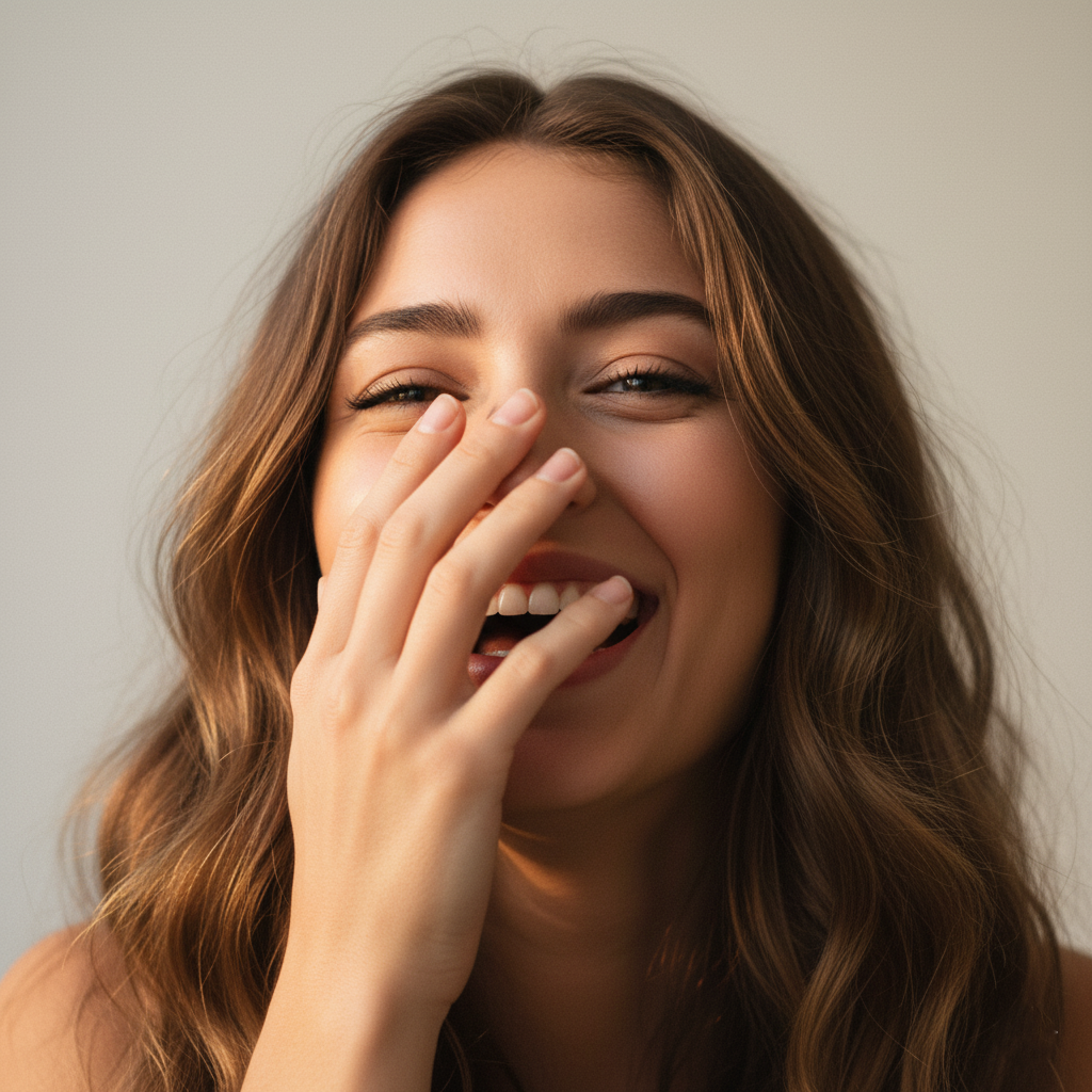 This pose works very well in both close-up portraits and medium shots. The key is not to completely hide the face, but rather to let the hand or fingers frame the smile. Half-closed eyes and cheeks slightly flushed with laughter add realism and warmth to the image. Furthermore, you can play with accessories or elements of the environment: for example, covering your face with a scarf, a sleeve, or even a hat to give it a more artistic or casual feel.