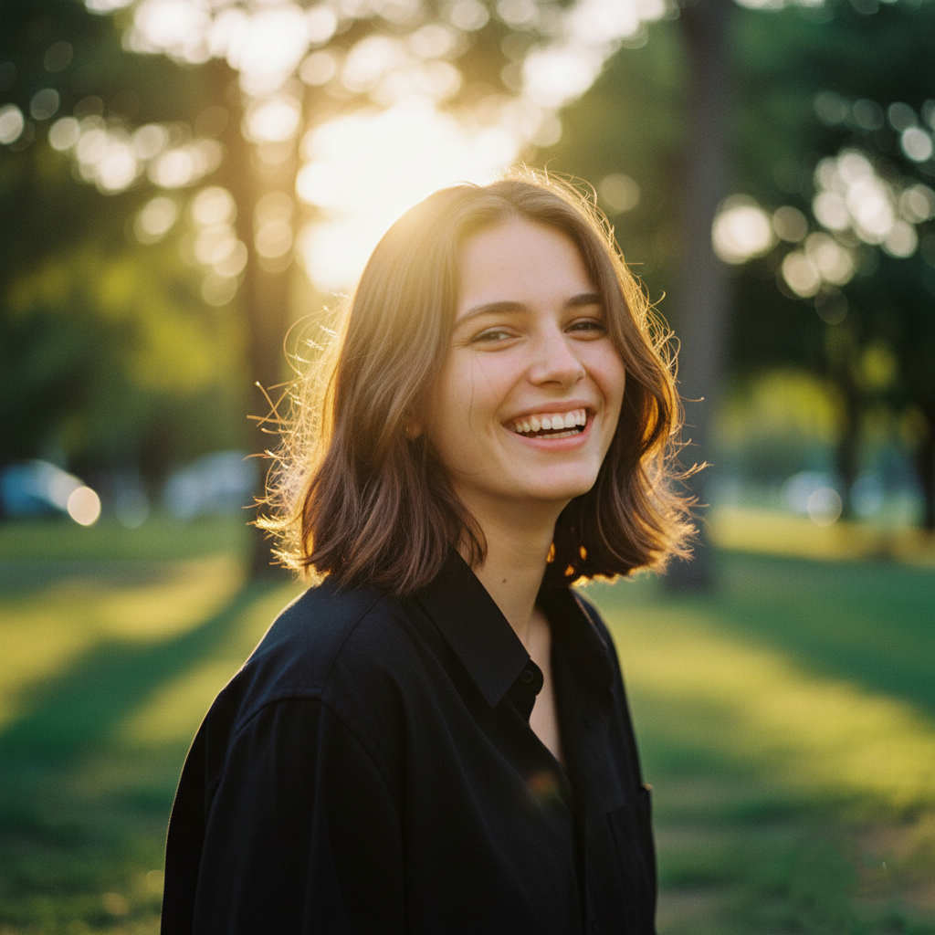 To achieve a balanced composition, the photographer can keep the focus on the eyes and smile, leaving the background slightly blurred. This way, all the attention is drawn to the emotion of the moment. It’s ideal for individual portraits as well as fashion or lifestyle photography shoots, where authenticity is key.