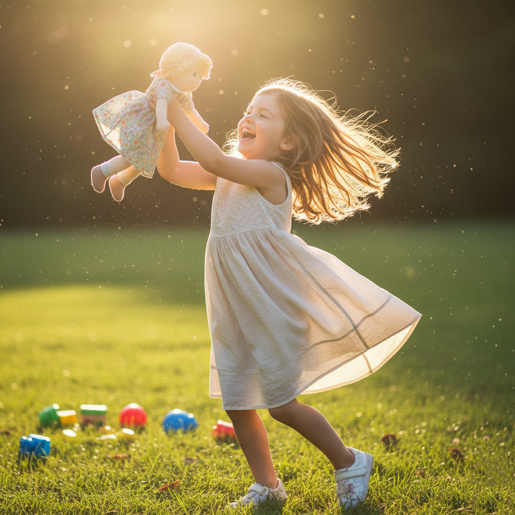 The ideal framing is at ground level, to capture the scene from the toy’s perspective. This generates a feeling of closeness and empathy, as if the viewer were also participating in the game. As for the lighting, soft, natural illumination is perfect for maintaining an intimate and warm atmosphere. The bright colors of the toys add vibrancy to the scene and highlight the joy of the moment.