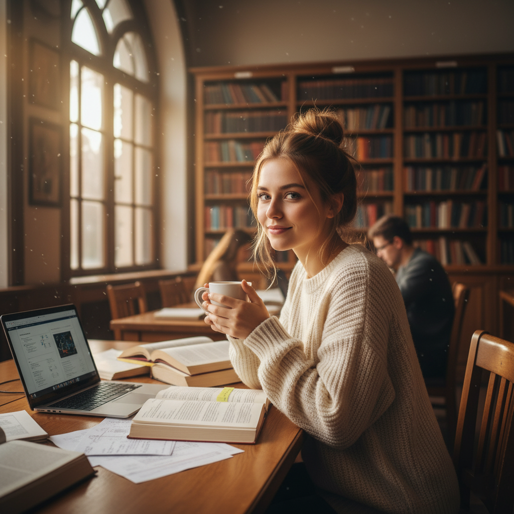The key is naturalness. You can sit at a table surrounded by books, hold a laptop, or write in a notebook while glancing at the camera, as if someone has captured a spontaneous moment of study. You can also rest your chin on your hand, looking out the window, conveying introspection and calm. If you prefer something more modern, put on headphones and let the environment evoke the style of a casual university study session.