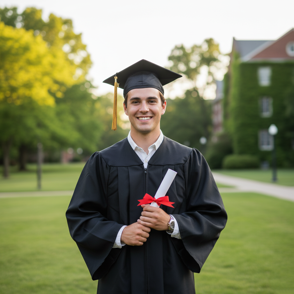 An ideal backdrop could be a wall with the university logo, a campus garden, or an iconic staircase. You can also play with depth of field to keep the diploma in focus while the background is softly blurred, emphasizing the achievement.