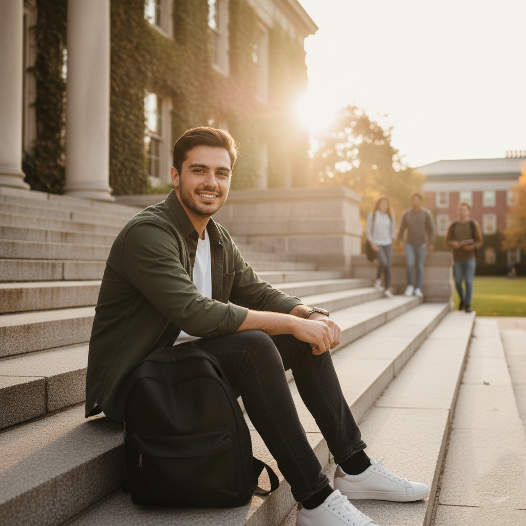 You can sit on one of the steps with your legs slightly bent, resting your arms behind you and gazing at the horizon or the camera with a serene expression. If you prefer a more artistic composition, cross your legs and rest your elbows on your knees while holding a book or your phone, evoking a break between classes. Another variation is to lean forward with a gentle smile, projecting a sense of approachability and spontaneity.
