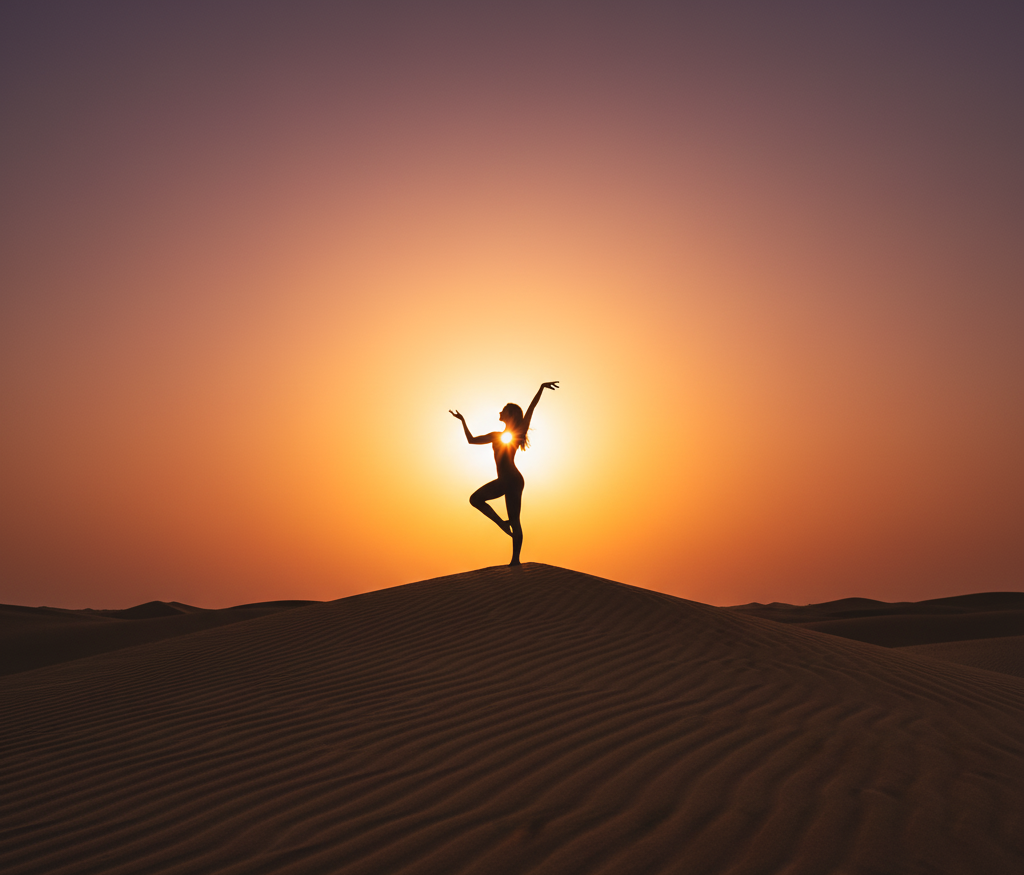Una de las poses más cautivadoras para fotos en el desierto es la silueta al atardecer. Esta idea aprovecha la luz dorada del sol cuando comienza a ocultarse, generando un contraste dramático entre el cielo y la figura humana. En este tipo de toma, la pose se convierte en un lenguaje corporal puro, sin depender de los detalles del rostro ni del vestuario. El cuerpo se transforma en una sombra que dialoga con el paisaje, y cada movimiento adquiere un sentido poético. Es una forma de expresar emociones profundas como libertad, melancolía o conexión con la naturaleza, utilizando solo la forma y la postura.