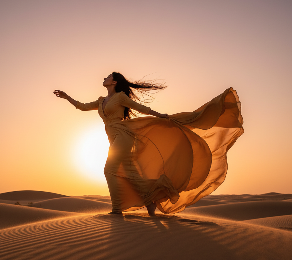 El desierto no solo invita a moverse o a desafiar el viento; también ofrece momentos de quietud y contemplación que pueden transformarse en imágenes profundamente poéticas. La pose sentada entre las dunas es ideal para transmitir serenidad, introspección y conexión con el entorno. En esta idea, el cuerpo se adapta al paisaje, encontrando equilibrio y descanso en medio de la vastedad. Sentarse sobre la arena permite jugar con las líneas curvas del terreno y con la textura suave que rodea al sujeto, creando una composición armoniosa y visualmente atractiva. Este tipo de pose se asocia con una energía más tranquila, evocando momentos de reflexión o calma después del movimiento.