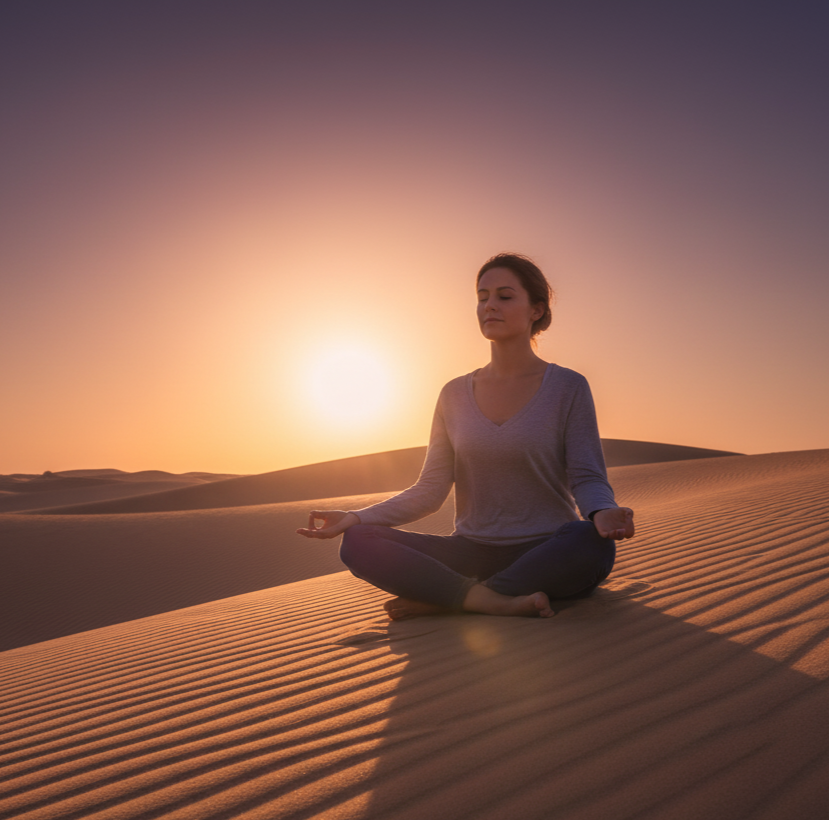 Esta pose es perfecta para expresar equilibrio y conexión interior. Sentarse entre las dunas simboliza una pausa en el viaje, un instante de calma dentro de un entorno vasto e imponente. La quietud se convierte aquí en una forma de belleza y autenticidad.