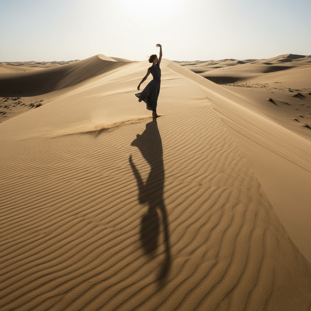 Fotografiar en el desierto exige una sensibilidad especial: hay que aprender a leer la luz, a escuchar el viento y a respetar el ritmo natural del entorno. La clave está en la conexión entre la persona y el paisaje, en permitir que el movimiento, la quietud o la expresión surjan de manera auténtica. En este tipo de escenarios, cada gesto cobra sentido y cada sombra se convierte en parte de la historia que la imagen quiere contar. No se trata solo de posar, sino de sentir y de dejarse llevar por la atmósfera inmensa y luminosa del desierto.