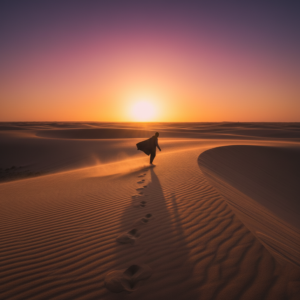 El entorno contribuye de manera esencial: el cielo despejado, las líneas suaves de las dunas y la luz del atardecer acentúan la idea de camino infinito. Este tipo de imagen conecta con emociones universales: la curiosidad, la esperanza y la búsqueda interior. En el desierto, cada paso deja una huella efímera, y eso mismo la convierte en una metáfora visual poderosa.