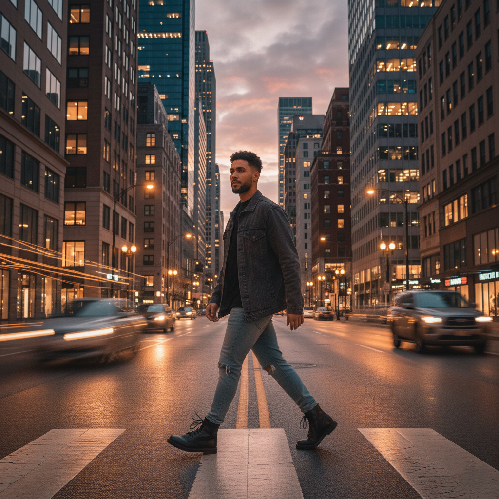 La ropa juega un papel fundamental: opta por atuendos que se integren con el paisaje urbano, como chaquetas de cuero, jeans, gafas oscuras o sneakers modernos. La luz natural de la tarde o el brillo de las luces urbanas durante la noche pueden realzar el movimiento y las texturas de la escena.